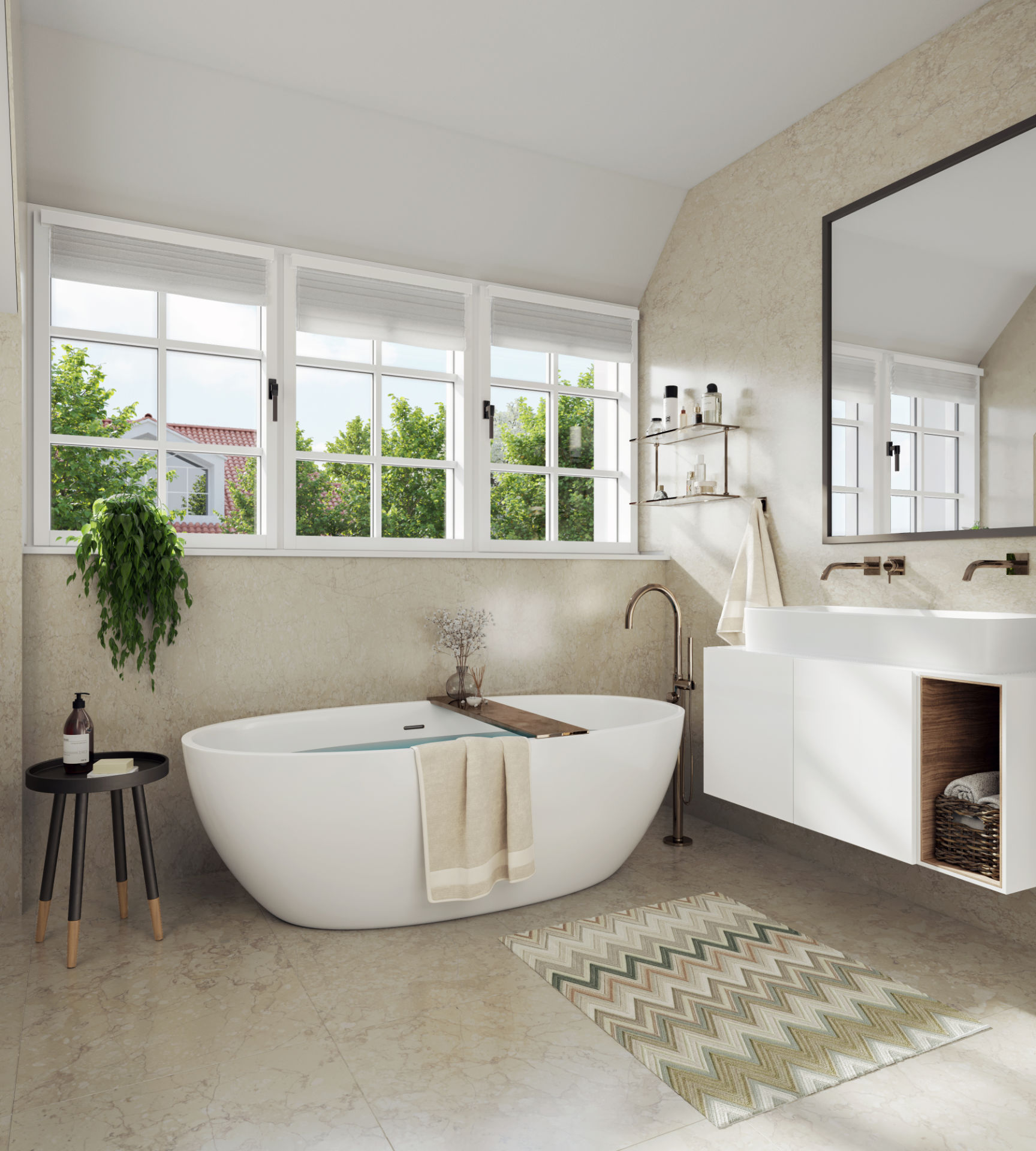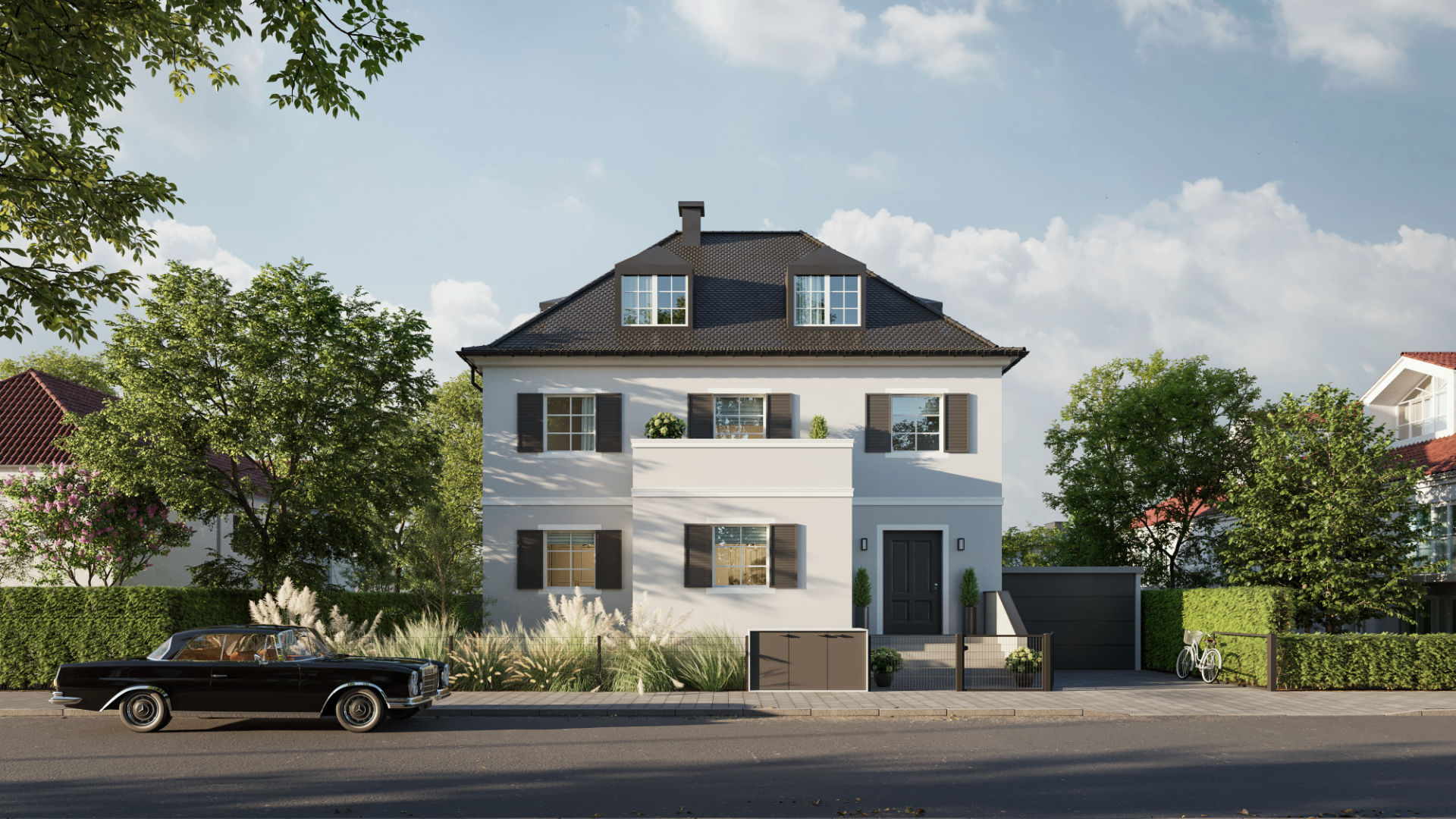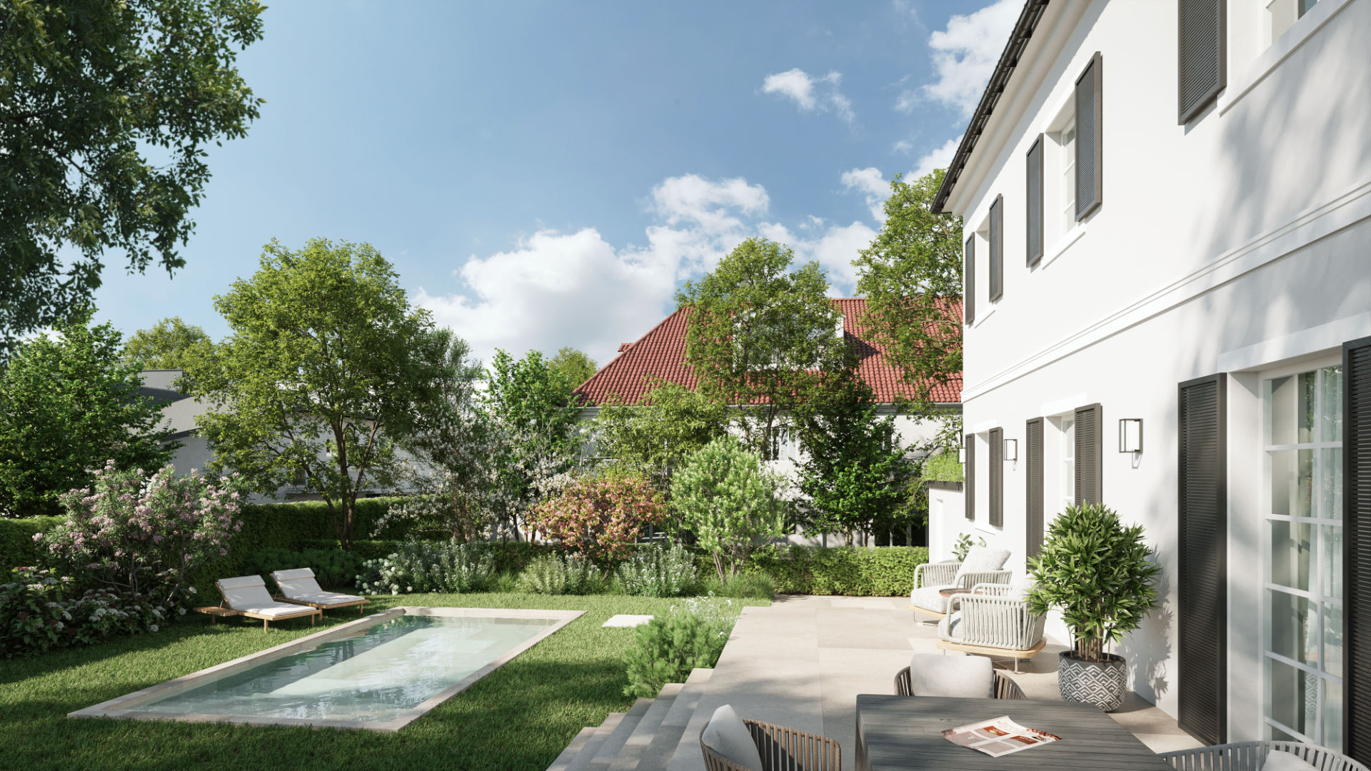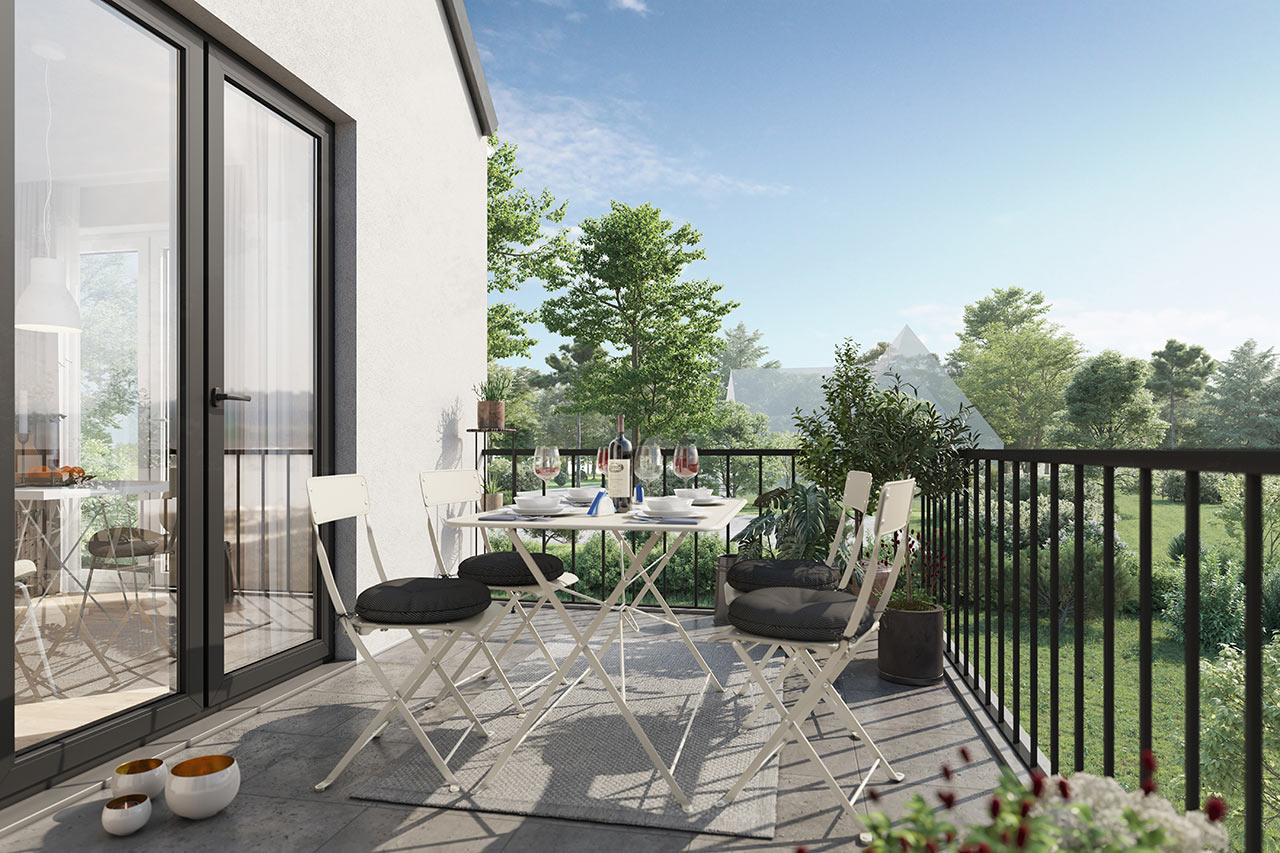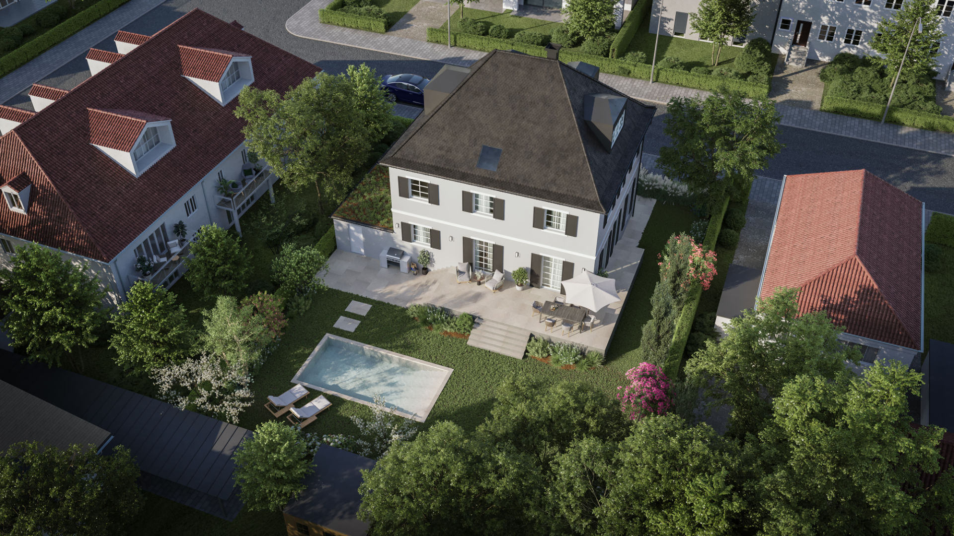 Die Visualisierung betont die harmonische Verbindung von Architektur und urban-grünem Umfeld. Ein Beispiel dafür, wie Ästhetik, Präzision und Stimmung ein überzeugendes Gesamtbild schaffen.