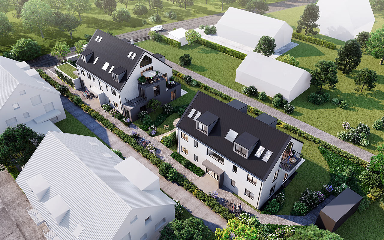 Für besonders realistische und überzeugende Architekturvisualisierungen erstellen wir auf Wunsch Fotomontagen auf Basis von Standortfotos oder Drohnenaufnahmen. So lassen sich Münchner Neubauprojekte präzise in ihre reale Umgebung einfügen und der spätere Eindruck bereits vor Baubeginn authentisch vermitteln.